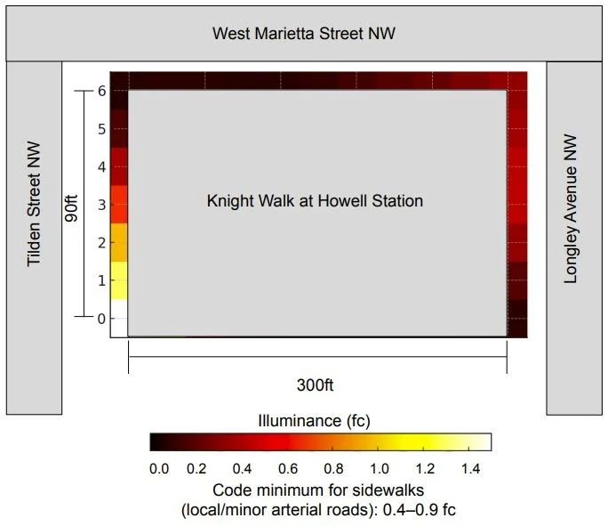 Proof: After installation of the recommended sconces and garden lighting, we returned on-site to re-test illumination levels. The follow-up analysis confirmed the lighting met or exceeded required thresholds. The City of Atlanta reviewed and formally accepted the report.